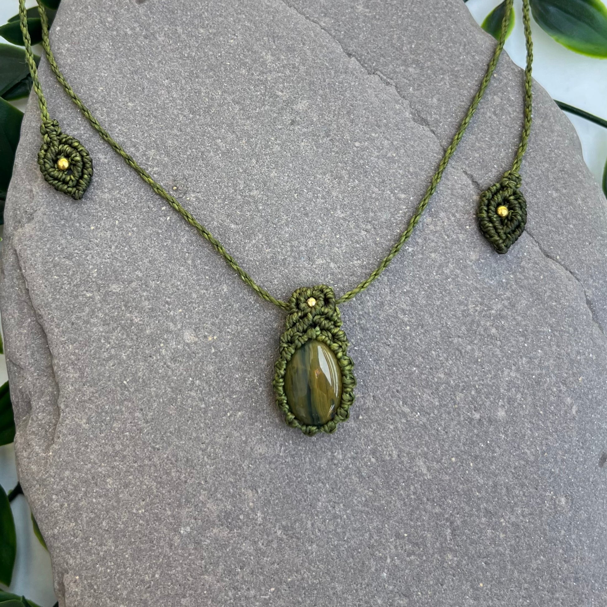 The centerpiece features a natural polished stone in deep green-brown tones, with subtle natural patterns. The exact type of stone is not confirmed, but its color and energy evoke the earthy qualities of green jasper or similar crystals.