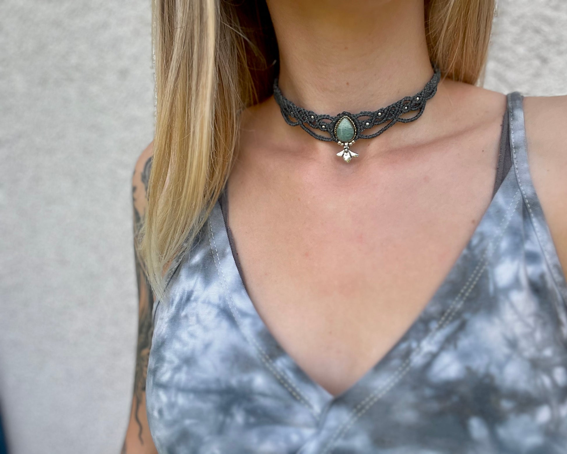 Makrame ogrlica je ročno izdelana iz visokokakovostnih vrvic, ki so izjemno trpežne. Vrvica je vodoodporna, barve so obstojne in ohranjajo svojo živahnost. V sredini je kristal, dopolnjen z medeninastimi perlicami.