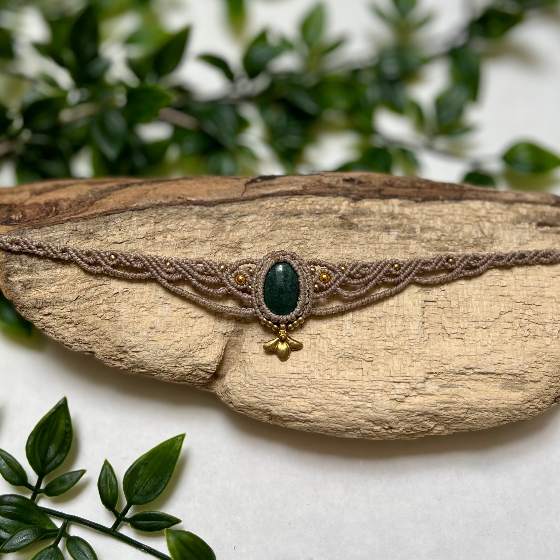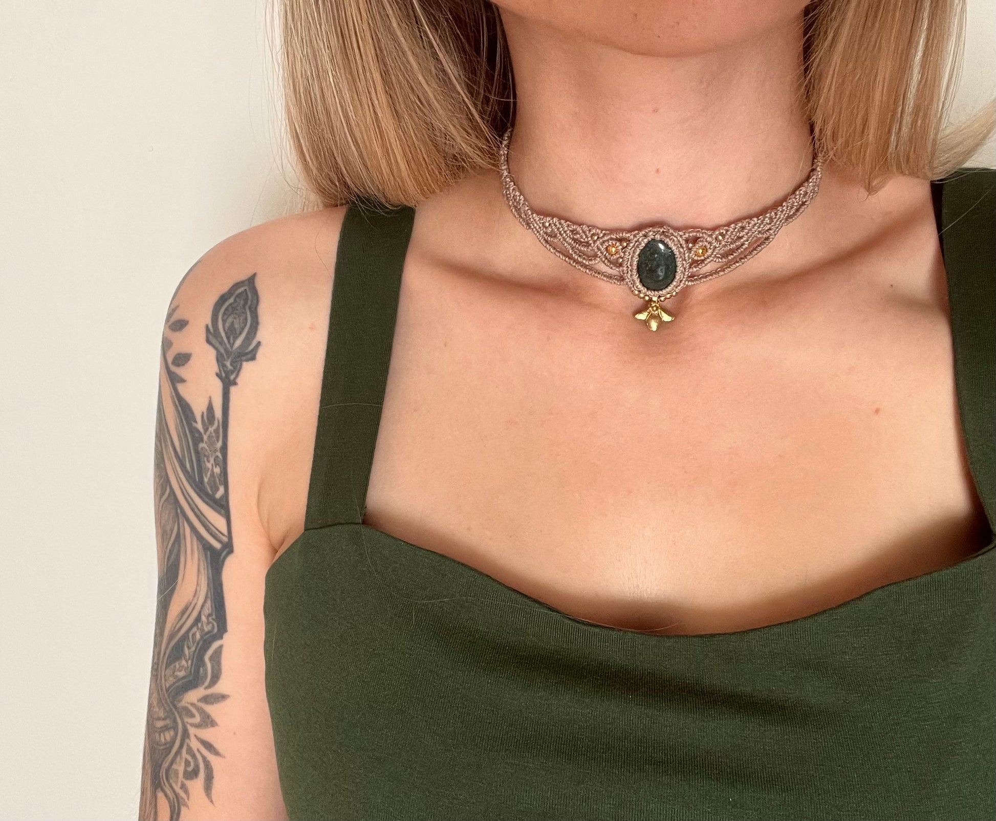 Makrame ogrlica je ročno izdelana iz visokokakovostnih vrvic, ki so izjemno trpežne. Vrvica je vodoodporna, barve so obstojne in ohranjajo svojo živahnost. V sredini je kristal, dopolnjen z medeninastimi perlicami.