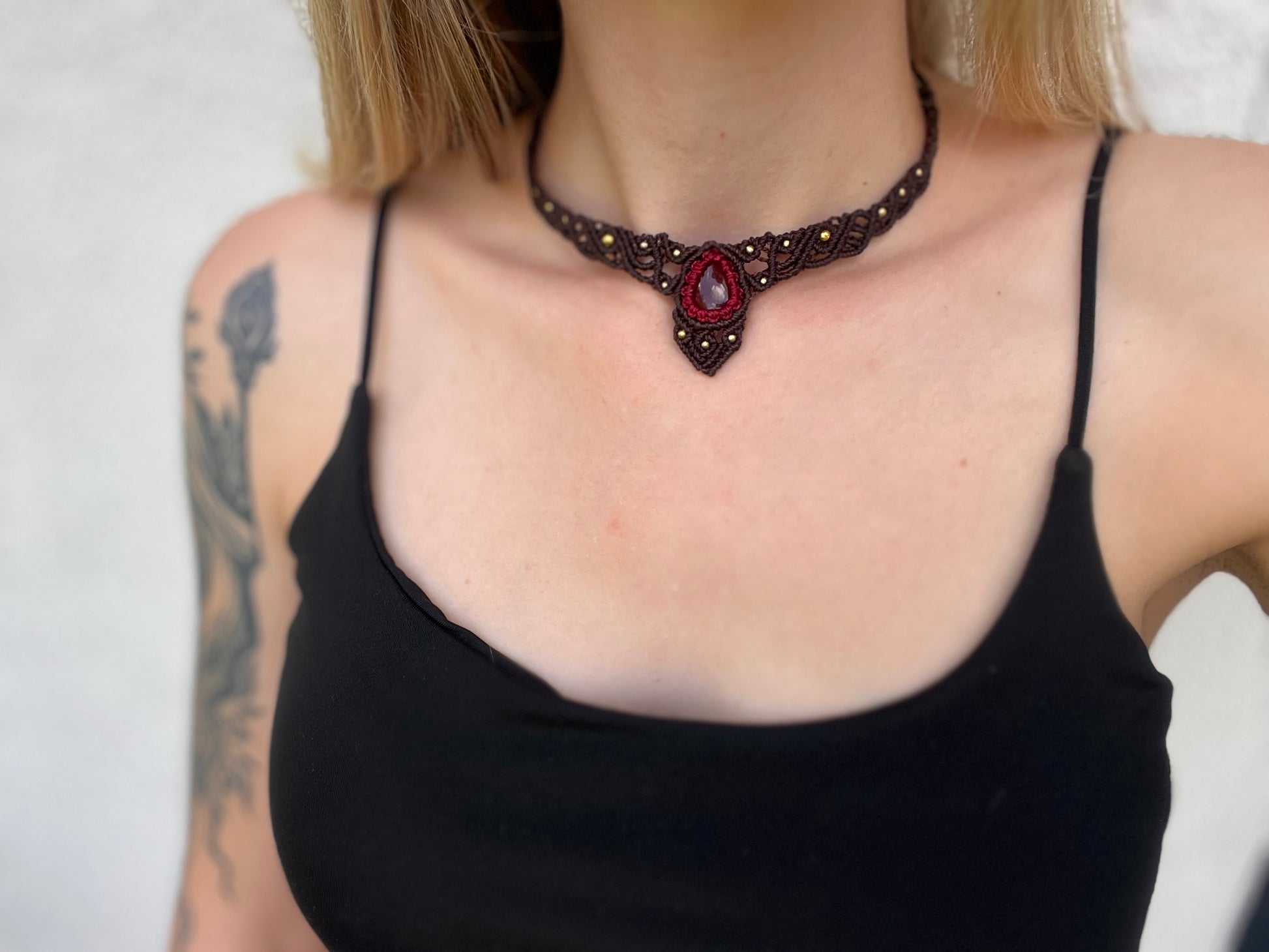 Makrame ogrlica je ročno izdelana iz visokokakovostnih vrvic, ki so izjemno trpežne. Vrvica je vodoodporna, barve so obstojne in ohranjajo svojo živahnost. V sredini je kristal, dopolnjen z medeninastimi perlicami.