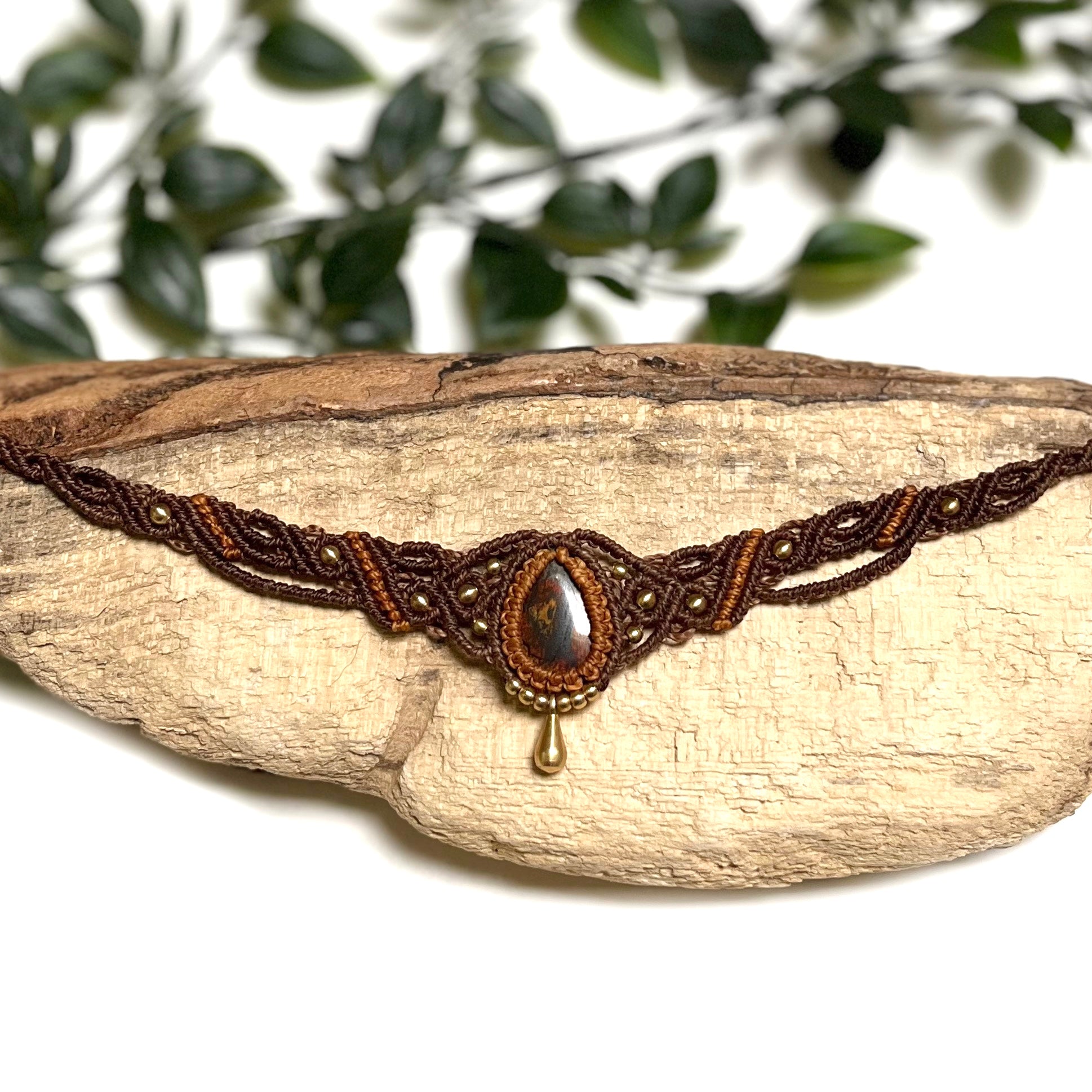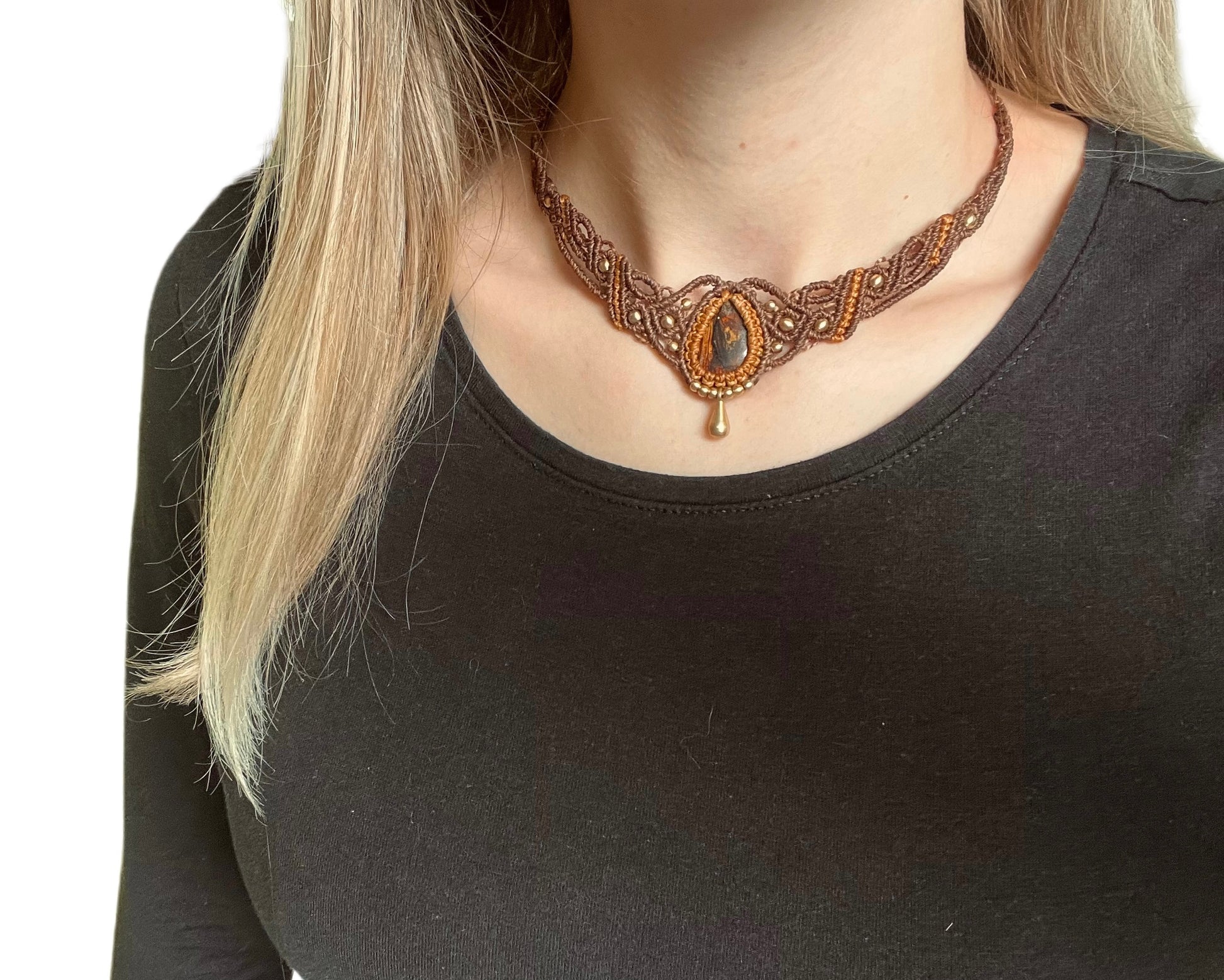 Makrame ogrlica je ročno izdelana iz visokokakovostnih vrvic, ki so izjemno trpežne. Vrvica je vodoodporna, barve so obstojne in ohranjajo svojo živahnost. V sredini je kristal, dopolnjen z medeninastimi perlicami.